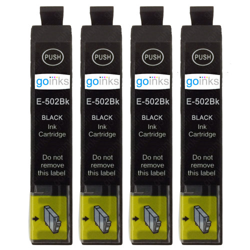 SummaryColour: BlackPack Size: 4Contains: 18.2mlReplaces: 502XLBkFor use with Epson WorkForce WF-2860DWF, WF-2865DWF, XP-5100, XP-51054 Go Inks Black Ink Cartridges to replace Epson 502XLBk Compatible / non-OEM for Epson WorkForce & Expression Printers DescriptionCompatible Black ink cartridge from Go Inks to replace your Epson cartridge. Our cartridges are designed to be a direct replacement to the OEM versions.